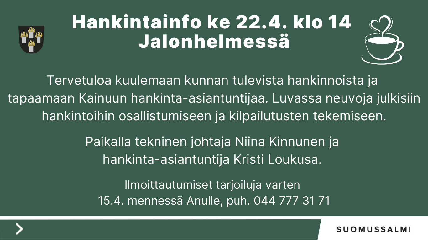 Tietoa hankinnoista keskiviikkona 22.4. klo 14Suomussalmen kunnan yrityspalvelut järjestää tilaisuuden kunnan tulevista hankinnoista. Samalla mahdollisuus tavata Kainuun hankinta-asiantuntija Kristi Loukusa. Yrittäjä, ilmoittaudu mukaan!