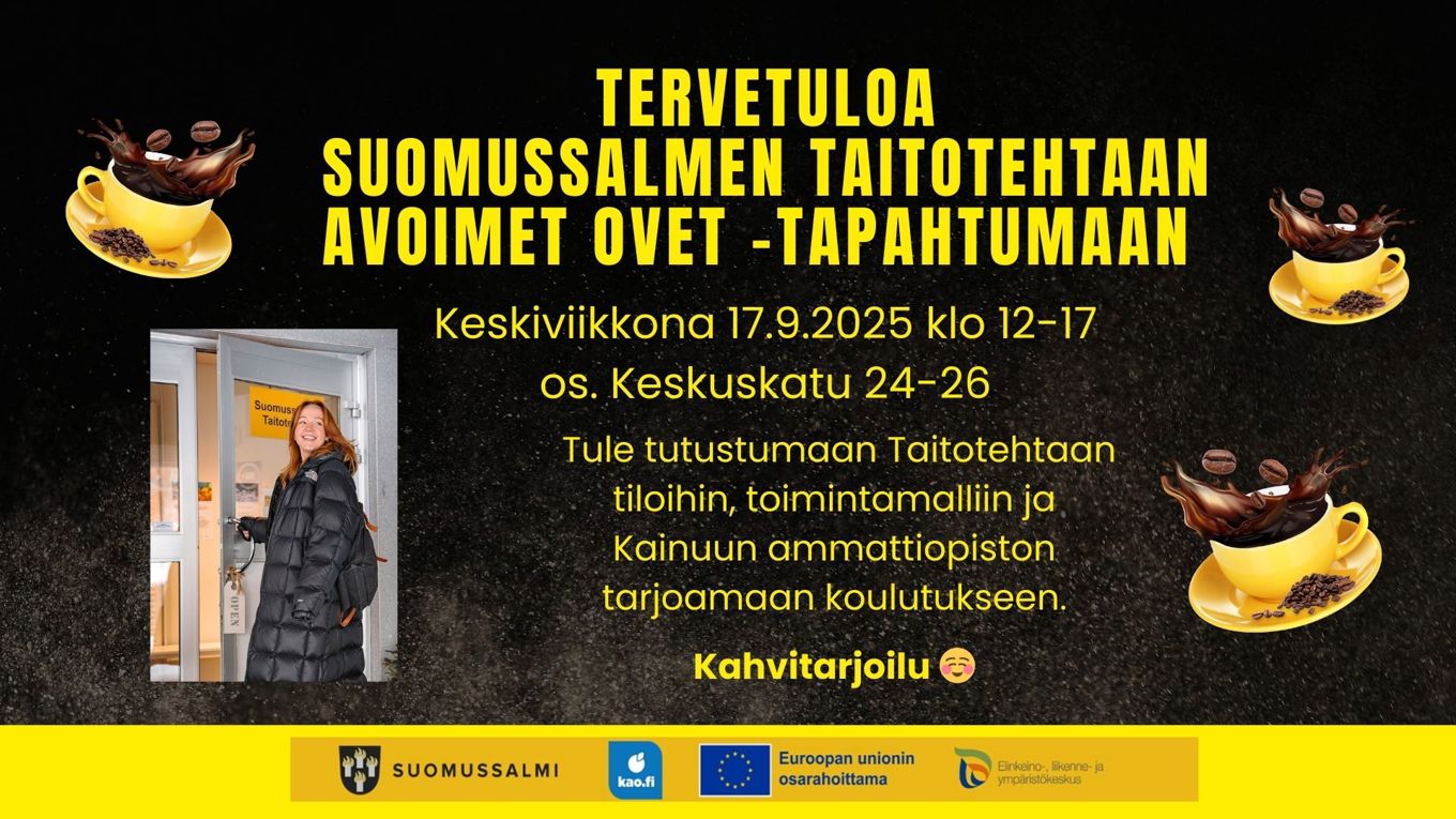 Julkaistu 28.8.2025 Muokattu 29.8.2025Tervetuloa tutustumaan Suomussalmen Taitotehtaan tiloihin ja toimintaan. Kahvitarjoilu! Huomaa päivämäärä! Julkaisun otsikossa oli alkuun väärä päivämäärä, joka korjattu 29.8.2025 klo 8.10.