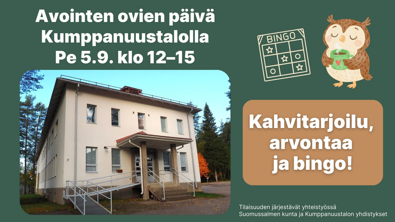 Suomussalmen kunta tukee kolmannen sektorin toimintaa monin eri tavoin. Yksi näistä tukimuodoista on Kumppanuustalo, jonka kunta tarjoaa maksutta paikallisten yhdistysten ja järjestöjen käyttöön. Kumppanuustalolla vietetään avointen ovien päivää perjantaina 5.9. klo 12 alkaen. Tilaisuudessa on kahvitarjoilu, bingo ja mahdollisuus kokeilla onnea arvonnassa. Tapahtuma on kaikille avoin ja maksuton.