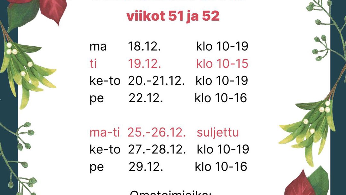 Kirjasto on kiinni joulun pyhinä ja uuden vuoden päivänä. Omatoimikirjasto on avoinna myös kiinniolopäivinä.