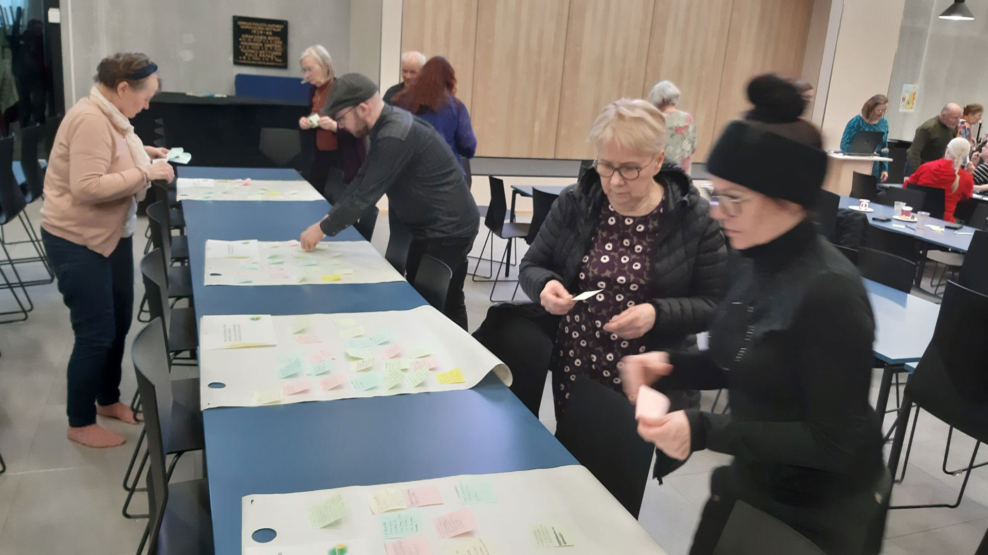 Kuvassa: Työpajassa osallistujat kirjoittivat post-it-lapuille näkemyksiään neljään hyvinvointialueen toimintaan liittyvään kysymykseen. Lopuksi vastauslaput tuotiin kunkin kysymyksen kohdalle.
