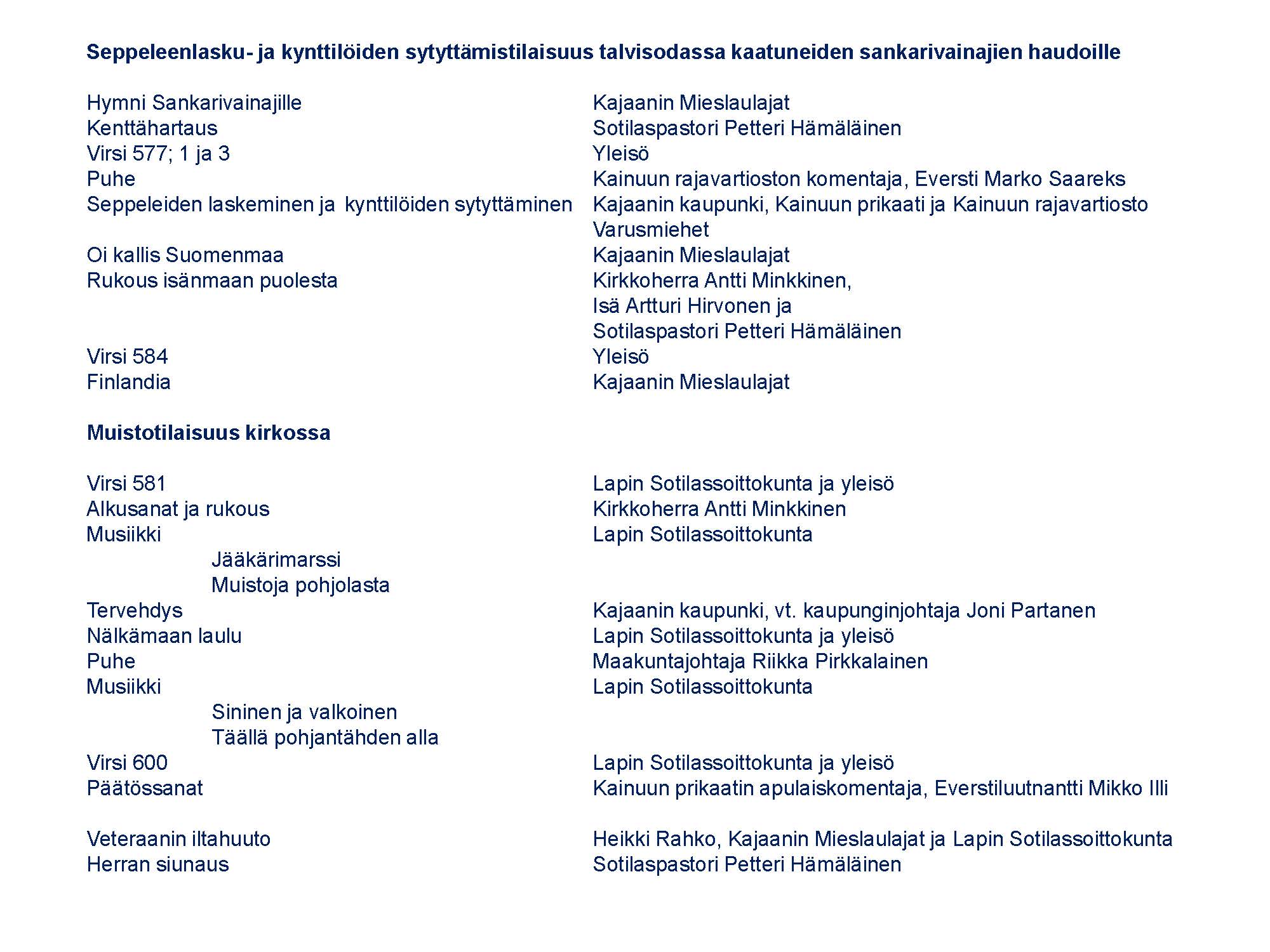 - Seppeleenlasku- ja kynttilöiden sytyttämistilaisuus talvisodassa kaatuneiden sankarivainajien haudoille