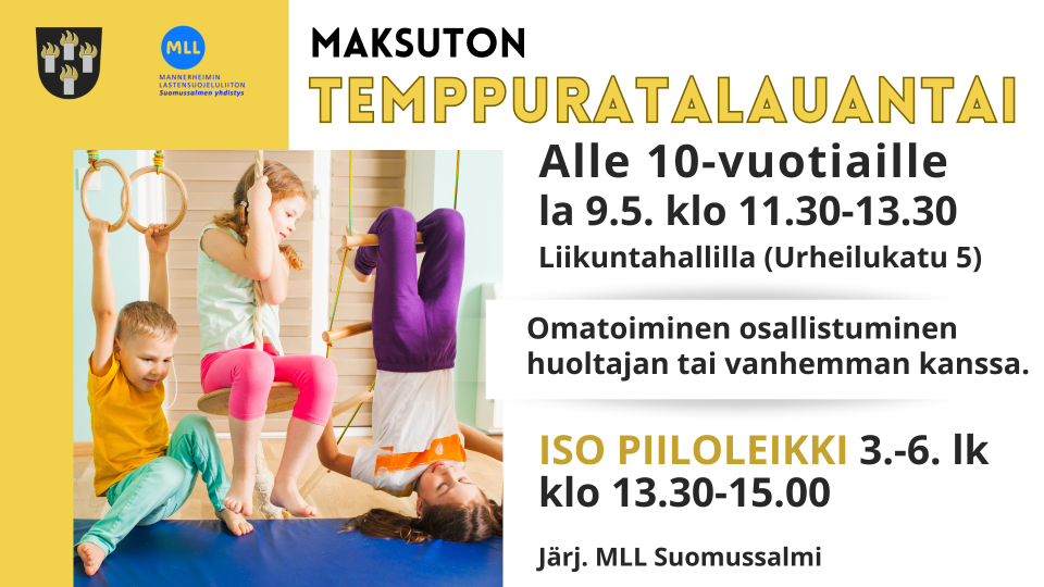 Maksuton liikunnallinen tapahtuma lapsille la 9.5. liikuntahallilla. Järjestäjinä MLL Suomussalmi ja Suomussalmen kunnan liikuntapalvelut.