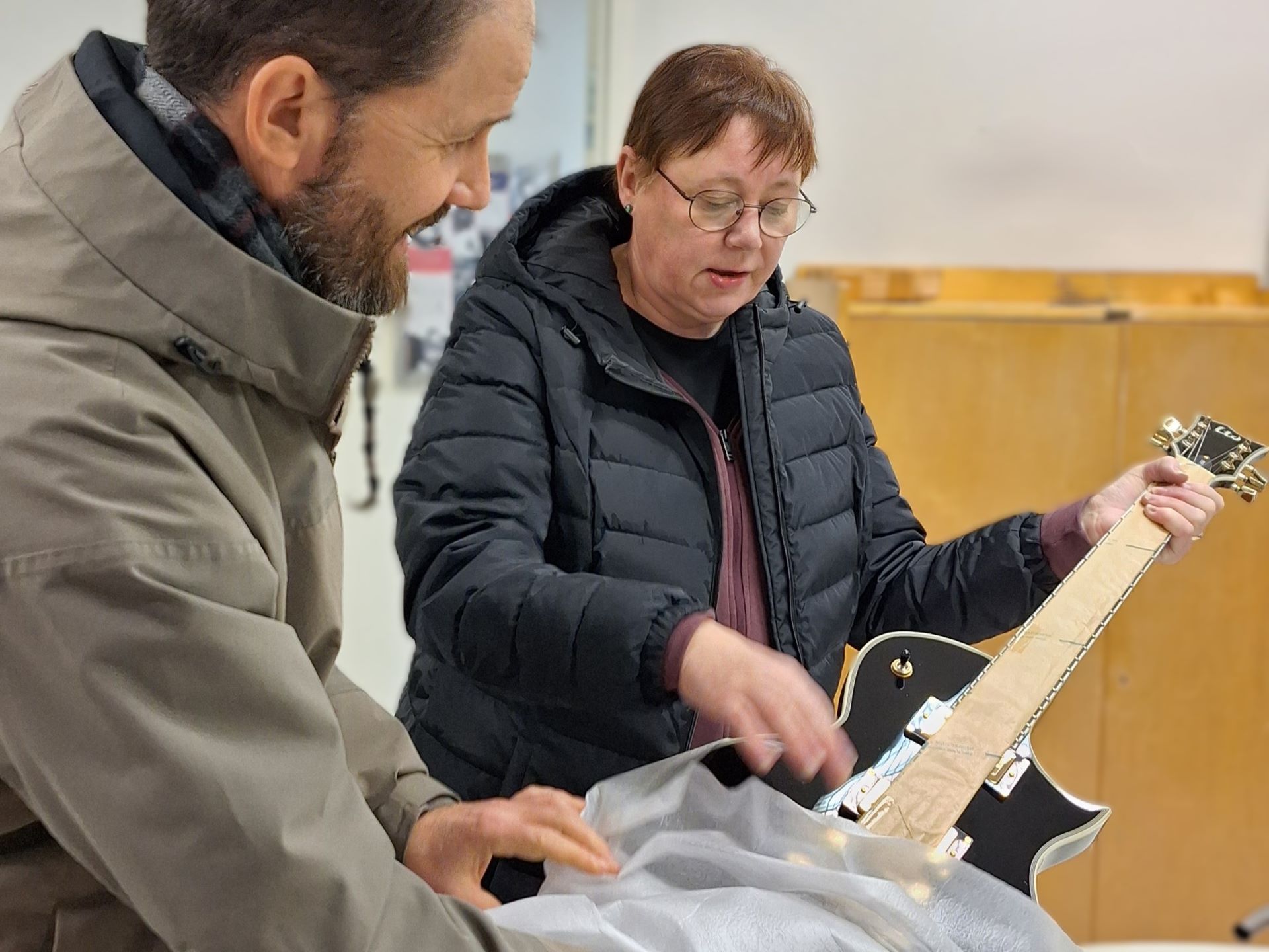 Kuvassa alla sivistysjohtaja ja nuorisosihteeri availevat tuliterää sähkökitaraa pakkausmateriaaleista.