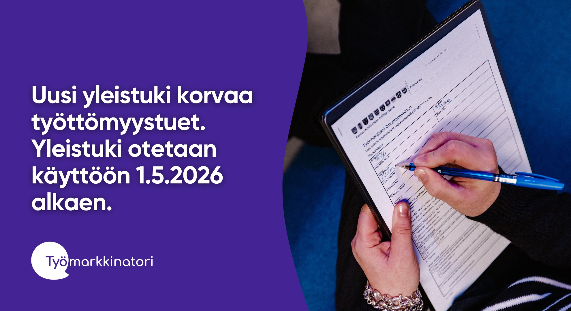 24.4.2026 Yleistuki korvaa työmarkkinatuen ja peruspäivärahanUusi yleistuki korvaa työttömien tuet: työmarkkinatuen ja peruspäivärahan 1.5.2026 alkaen. Kuten aiemmat työttömyystuet, yleistuki turvaa toimeentuloasi, kun haet töitä.