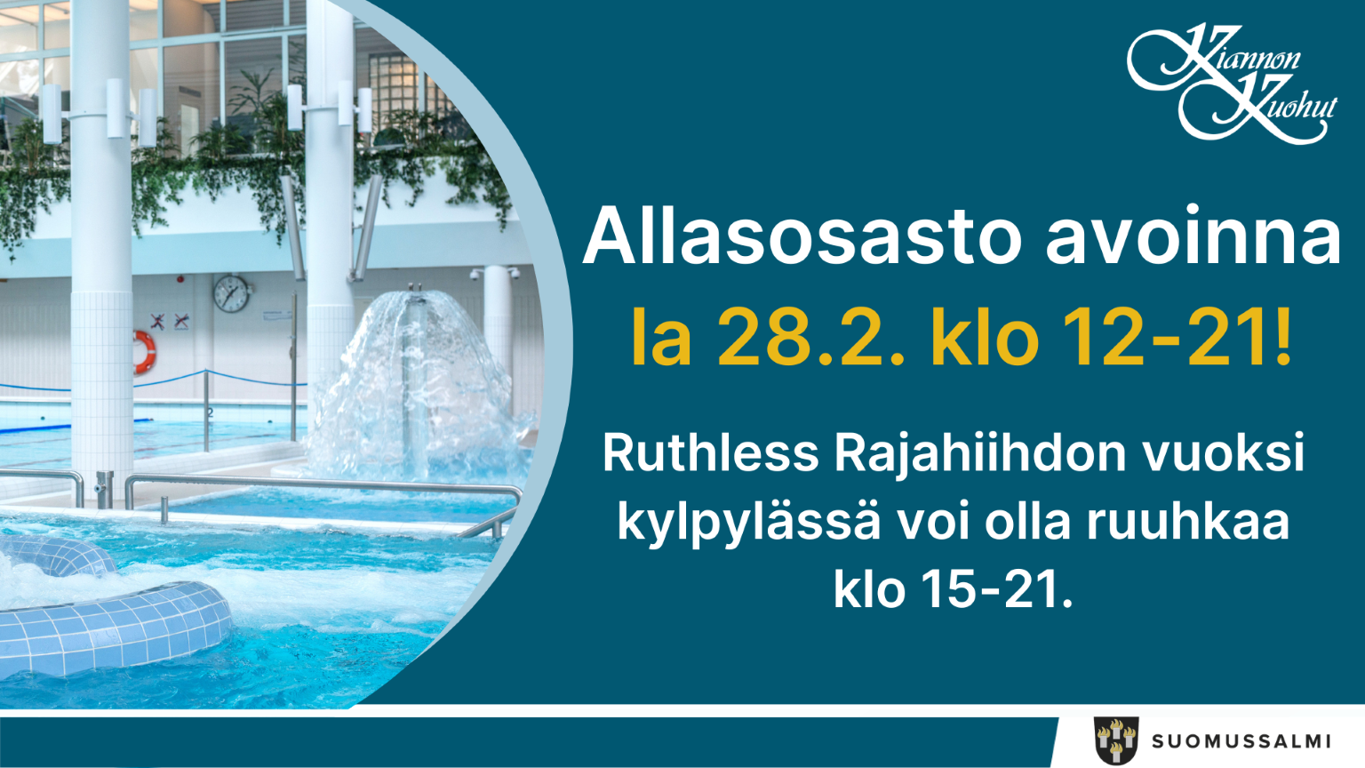 24.2.2026 Ruthless Rajahiihto la 28.2.2026Allasosasto on avoinna klo 12-21. Hiihdon vuoksi kylpylässä voi olla ruuhkaa klo 15-21.