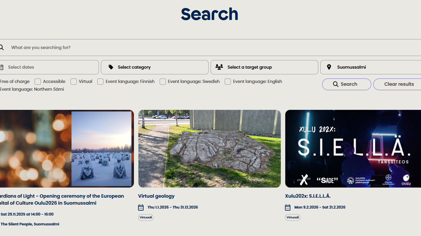 You can find all events of the European Capital of Culture year at oulu2026.eu Suomussalmi’s contribution to Oulu2026 stands out with its originality, depth and strong local character. From immersive art experiences in the Silent People installation to community-driven cultural hikes and intimate concerts, Suomussalmi brings forward a vibrant and meaningful cultural voice from the heart of Kainuu. These events highlight the power of place-based creativity and invite audiences to experience culture in new and unforgettable ways.