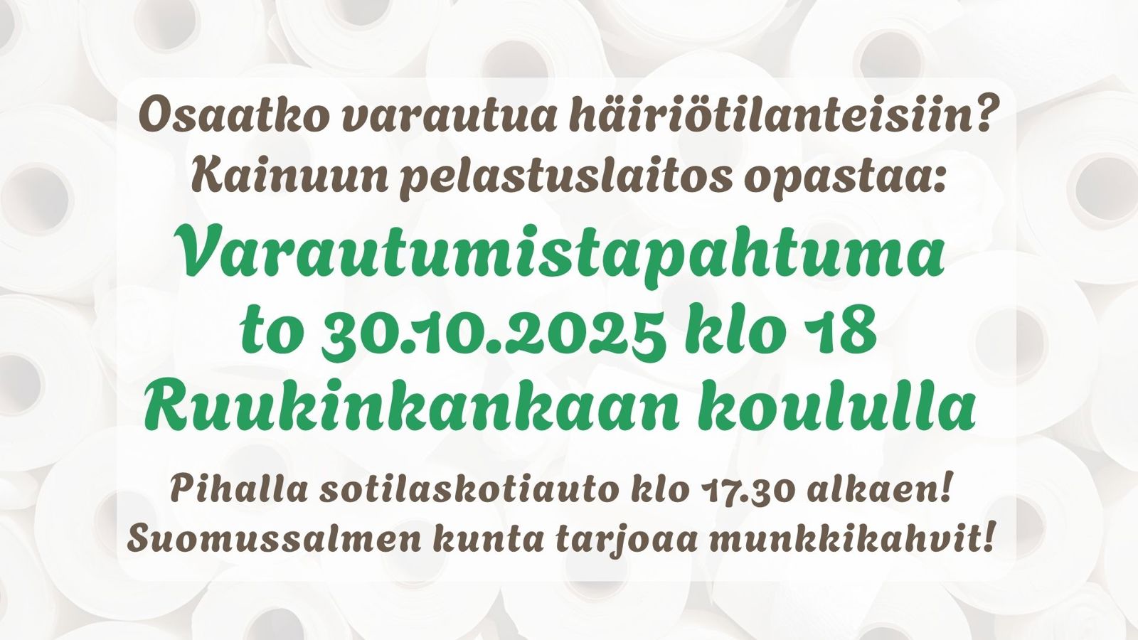 Kainuun pelastuslaitos järjestää avoimen tilaisuuden, jossa keskustellaan kotitalouksien varautumisesta kriisi- ja häiriötilanteisiin. Tule kuuntelemaan, kysymään ja jakamaan ajatuksia! Tilaisuus alkaa Ruukinkankaan koululla to 30.10.2025 klo 18. Kajaanin Sotilaskotiyhdistyksen myyntiauto on paikalla jo klo 17.30.