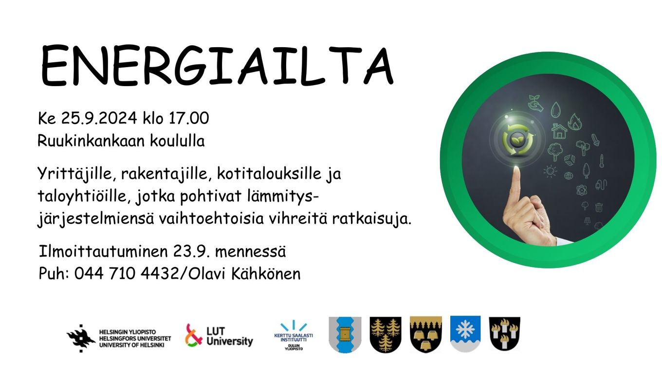 Ylä- ja Itä-Kainuun vihreän siirtymän osaamiskeskus -hanke, Suomussalmen kunta ja Kianta-Opisto järjestävät yhteistyössä Suomussalmen vihreän siirtymän energiaillan keskiviikkona 25.9.2024 alkaen klo 17 Ruukinkankaan koululla (Ruukintie 5, Suomussalmi) ja Teams-yhteydellä.