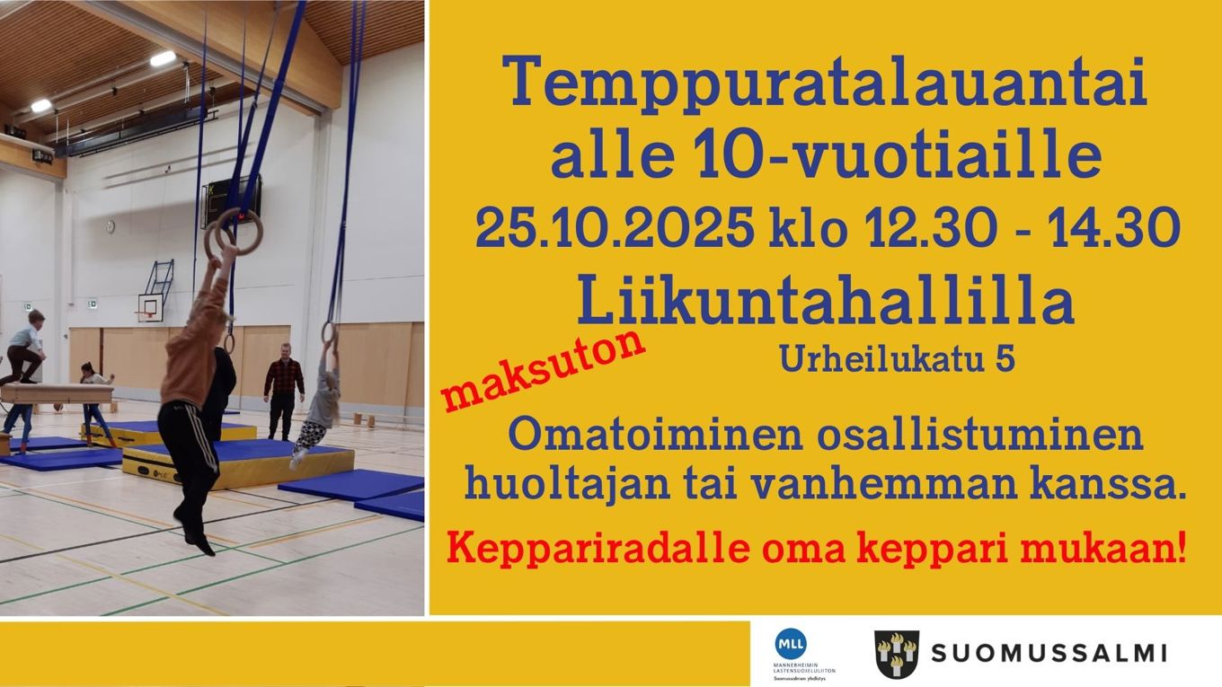 Julkaistu 10.10.2025 Muokattu 10.10.2025Temppuratalauantai tulee jälleen! 25.10.2025 klo 12.30 alkaen Liikuntahallilla! Järjestämisvuorossa MLL, yhdessä kunnan liikuntapalvelujen kanssa. Maksuton tapahtuma on tarkoitettu alle 10-vuotiaille, ja siihen osallistutaan huoltajan kanssa.