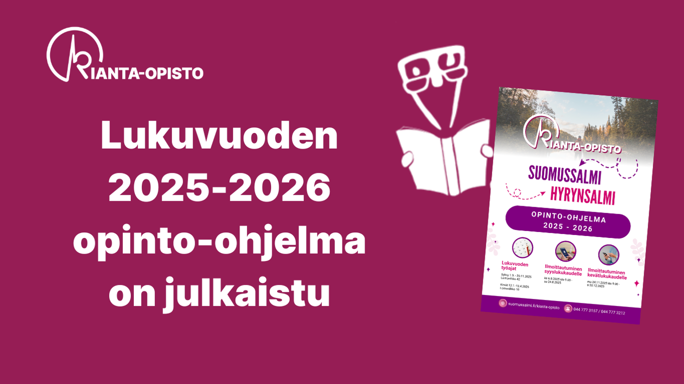 19.6.2025 Kianta-Opiston opinto-ohjelma 2025-2026Kianta-Opiston opinto-ohjelma lukuvuodelle 2025-2026 on julkaistu. Ilmoittautuminen kursseille alkaa ke 6.8.2025 klo 9.00.